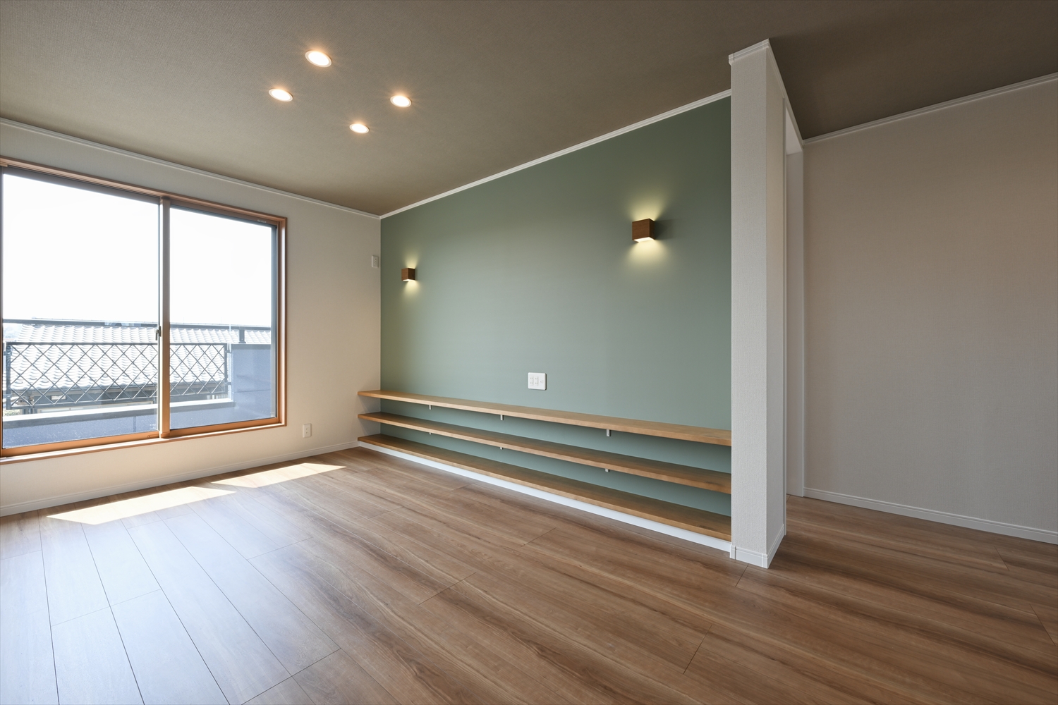 使われていなかった2階の居室を、第2のリビングへリフォーム。グリーンのアクセントクロスと横長の造作棚を設け、家族がくつろげるもうひとつの居場所に生まれ変わりました